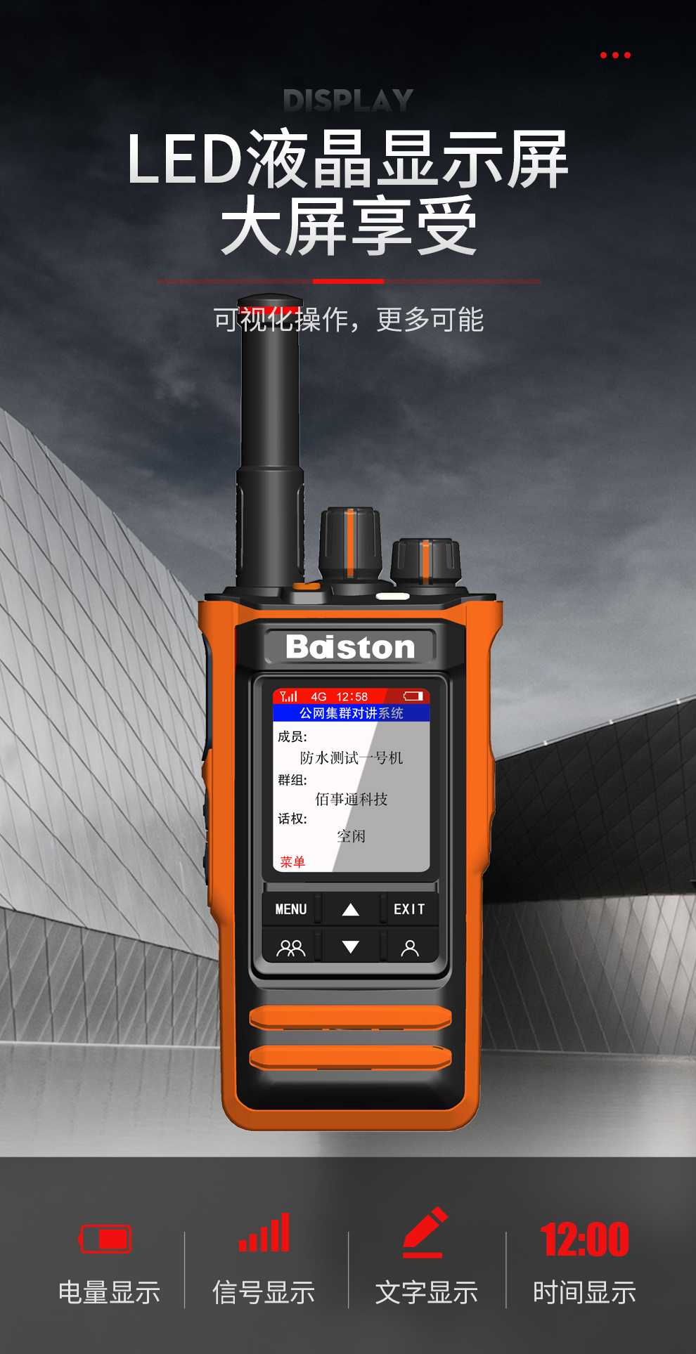 佰事通BST-G50S公网集群对讲终端简介: 产品尺寸:1226236mm(不含天线)/1786236mm(含天线) 产品重量:360g(整机) 电池类型:锂电池组 额定电压:3.6V-4.2V 电池容量:6800mAh 天线类型:...