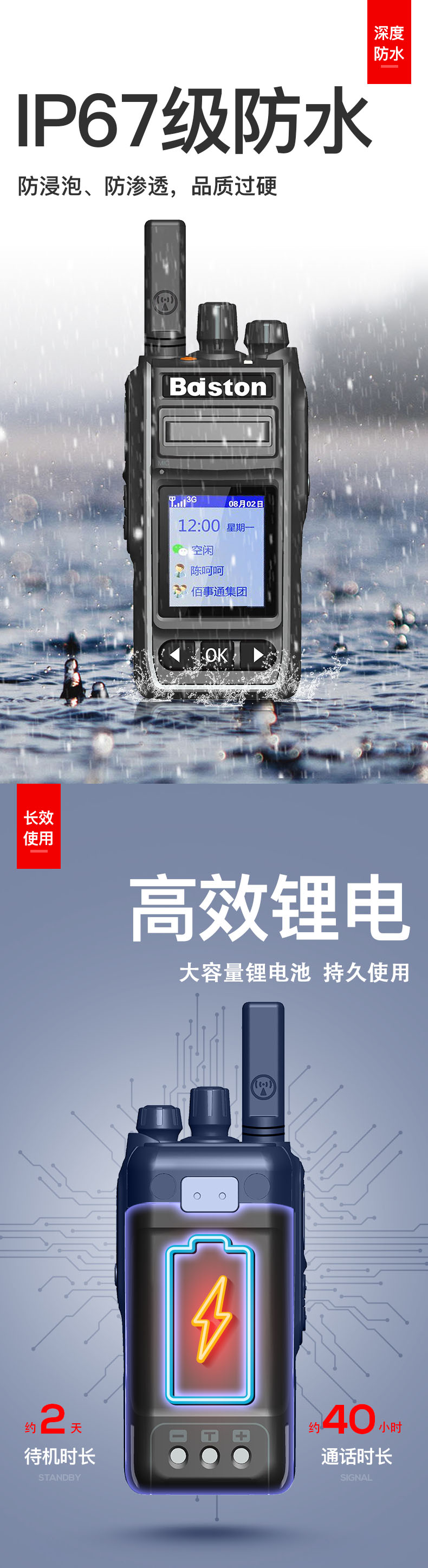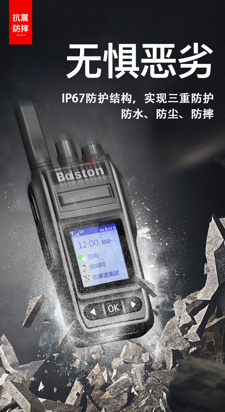 可水洗 可浸泡 真防水 5000公里 全国对讲 型号核准代码:2020CP3831 通过省级质量检测单位IP67防水防尘检测合格 双色注塑工艺,外观专利设计 采用移远EC20通讯模组 支持单呼、组呼、群呼...